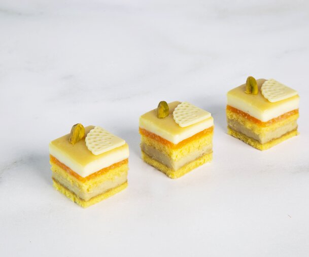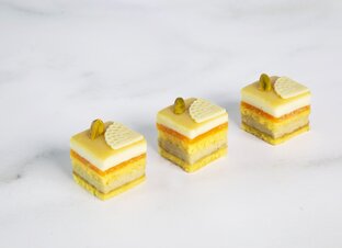 versare 900g di namelaka sul gelificato, all'interno di 1 quadro in acciaio 36cmx36cm altezza 3cm, ed abbattere di temperatura