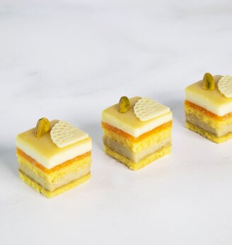 Dopo completo congelamento decorare la superficie con BLITZ ICE TOP, sformare dal cerchio di acciaio e decorare a piacere, utilizzando CRUNCHY BEADS WHITE.